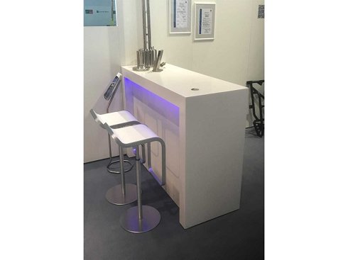 Encimera blanca con tira LED integrada en la parte delantera y cuatro armarios en la parte trasera |