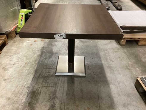 Base de mesa de acero inoxidable, columna de roble teñido de wenge, acero cruzado atornillado negro Encimera de encierro teñido y lacado en roble 90x90x5,5 cm Palé a cambio