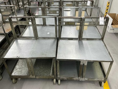 Conjunto de 4 carros de transporte fabricados en acero, con estructura robusta y dos estantes para carga. Equipados con ruedas giratorias y asas de empuje para facilitar la movilidad en almacenes, talleres o líneas de producción.