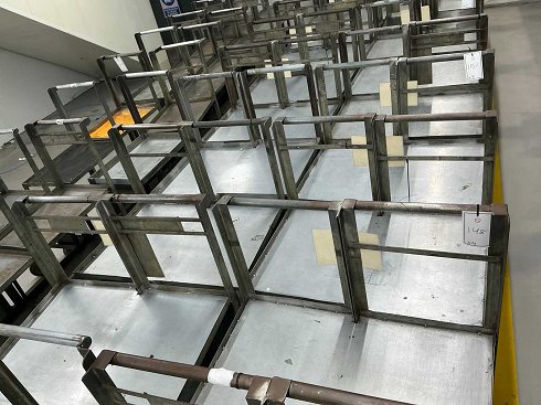 Lote de carros metálicos industriales Conjunto de 4 carros de transporte fabricados en acero, con estructura robusta y dos estantes para carga. Equipados con ruedas giratorias y asas de empuje para facilitar la movilidad en almacenes, talleres o líneas de producción. Dimensiones aproximadas de cada carro: 60 x 90 x 120 cm Funcionalidad no comprobada.