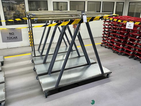Conjunto de carros metálicos tipo caballete equipados con ruedas giratorias. Estructura superior en forma de “A”, diseñada para el transporte o soporte de paneles, piezas planas o utillajes.