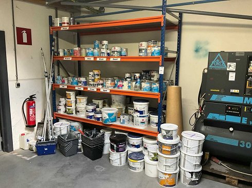 Sala del compresor: compuesta por estantes de almacén con 2 postes verticales y 8 vigas con contenido de varias pinturas y cubos para pintura |