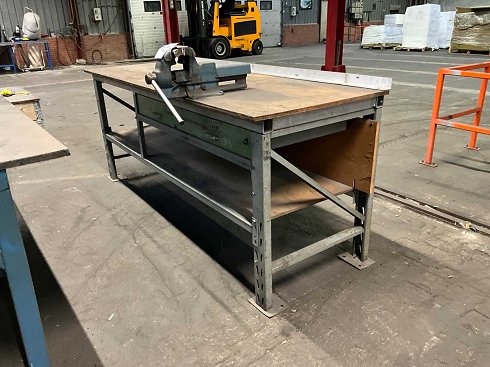 base de acero perfilada; la superficie de la mesa de madera; tamaño de la mesa 2200x770 mm; altura de la mesa 900 mm; equipado con una mordaza de prensa Heuer de 150 mm de ancho de mandíbula; equipado con 2 cajones; |