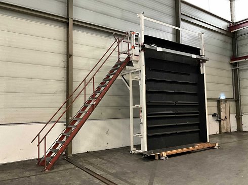 acero de sección; construido y desmontable; equipado con suelo de lamas de amarilla de acero galvanizado; altura del andén aproximadamente 3650 mm; incluyendo una escalera de acceso de acero con perfil y 15 escalones en rejilla; altura de desplazamiento por escalón aproximadamente 230 mm; tamaño total del suelo de la construcción aproximadamente 7500x1500x5350 mm; incluyendo construcción de muros de madera e iluminación integrada; |