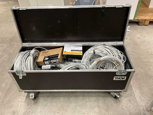 | Nombre | Caja de transporte, 4 ruedas giratorias, tecnología LAN y cables |