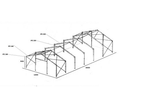 La estructura consta de 2 vigas (cerchas en los extremos) hechas de perfil IPE 160; 5 vigas intermedias (cerchas de perfil) del perfil IPE 220; 4 columnas finales del perfil IPE 160; 10 columnas intermedias del perfil IPE 220; 4 columnas de puertas de tubo cuadrado 100x100x4; 6 postes de presión de la tubería 76x4; refuerzo para vigas y columnas de acero galvanizado con tensor de 16 mm;