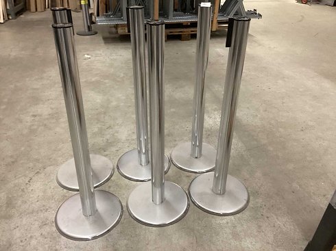 6 tensadores, cintas de barrera, directrices Colores de aluminio con banda negra ancha Longitud de la correa, aprox. 2,50 m Altura 1 m Color: Plateado, cromado