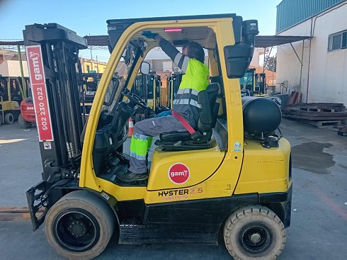Carretilla elevadora GLP Hyster H2.5FT. Altura de elevación 3,9 metros y capacidad de carga de 2500 Kg. Año de fabricación 2019.