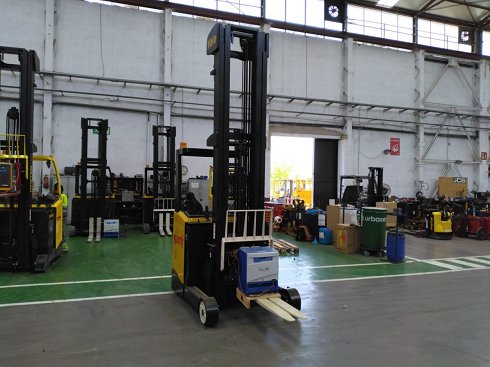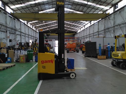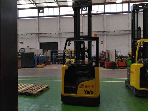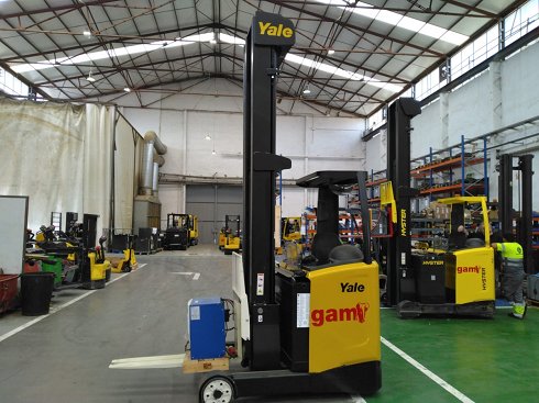 Carretilla retráctil YALE MR14. Altura de elevación 9,5 metros y capacidad de carga 1400 Kg. Año de fabricación 2017.