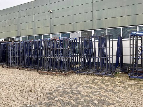 Bastidor de transporte de acero / puente (doble cara), equipado con perfiles de protección de goma, ojo de elevación, agujeros para la cuchara de la carretilla elevadora, con contenido |