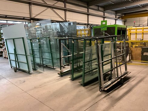 Chasis de acero con 2 ruedas, con varios componentes de vidrio |