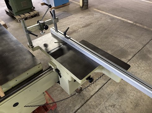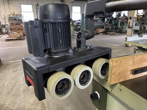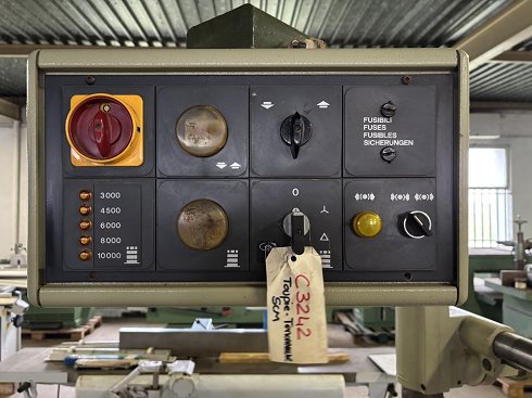 | Detalles | Technical characteristics Router-tenoner with tenoning carriageWorking table dimensions : 1200 x 750 mmSpindle length : 180 mmSpindle diameter : 50 mmMax. tool diameter : 200 mmMotor : 5.5 kW (7.5 hp)Shaft speeds : 3000, 4500, 6000, 8000 and 10000 RPM550 mm wooden guides (ELBE aluminum in option)3 roller feederCast-iron tenoning carriage with aluminum guide Power and Motors Voltage: 380 VPluging: Three-phasedPower: 6 KwMotor: 7,5 CV Overall dimensions |