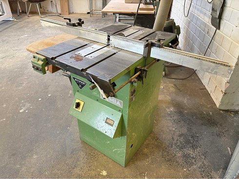 Máquina No. 540, unidad de sierra giratoria y ajuste de altura mediante volante, ancho de mesa aprox. 500 mm, profundidad de mesa aprox. 760 mm, tablero de mesa móvil y posicionable lateralmente, regla con tope derecha/izquierda (El artículo está en condiciones existentes y sin verificar. ¡Los costos de desmontaje y carga son vinculantes! ¡El artículo se vende sin contenido / material!) |