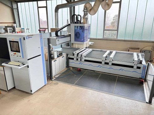 Máquina nº 0-201-21-6244, longitud de la pieza con diámetro máximo de la herramienta aprox. 3225 mm, longitud de la pieza de trabajo en todas las unidades máx. aprox. 3050 mm, ancho de la pieza tope trasero con diámetro máximo de herramienta. aprox. 1550 mm, ancho de pieza tope trasero de todas las unidades máx. aprox. 1400 mm, husillo principal aprox. 18 KW con eje C e interfaz para Flex-5, velocidad del husillo principal 0 - 24000 rpm., cambiador de discos de 10 y 18 velocidades, cabeza de taladro MPU 360° V20/H10/sierra/S360° con aproximadamente 30 husillos y motor controlado por frecuencia de 2,7 kW, Velocidad de recorrido en el eje X-Y aproximadamente 80 m/min y eje Z aprox. 30 m/min., consola K sistema de visualización de posición LED, soportes de 6 piezas con una longitud aproximada de 1340 mm, bomba de vacío, control de potencia PC85 con WoodWOP 5.0 (El artículo está en condiciones existentes y sin revisar. ¡Los costes de desmontaje y carga son comprometedores! ¡El artículo se |