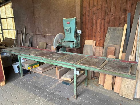 Motor aprox. 2,6 KW, diámetro de la hoja de sierra aprox. 460 mm, longitud de la mesa aprox. 4000 mm y ancho del rodillo aprox. 500 mm (El artículo está en condiciones tal como existe y no ha sido probado. Los costes de desmontaje y carga son vinculantes y el artículo se vende sin contenido ni material).