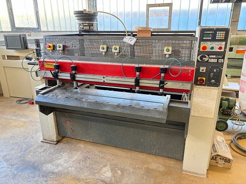 Máquina nº 097971, longitud máxima de la pieza aprox. 1250 mm, unidad de perforación horizontal con 1 husillo y motor aprox. 0,75 KW, unidad de perforación vertical con 1 husillo y motor aprox. 0,75 KW, boquilla de pegamento con unidad de inserción de varilla horizontal, dispositivo de sujeción de la pieza (El artículo está en condiciones existentes y sin probar). Los costes de desmontaje y carga son vinculantes y el artículo se vende sin contenido ni material). |