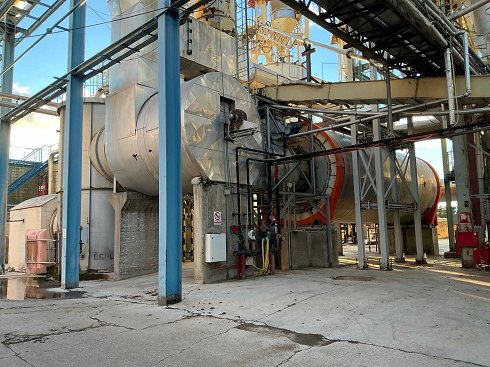 - Actualizado en 2002. - Potencia eléctrica total instalada aprox. 200 KW. - Capacidad 10000 kg/h (atro) - Evaporación de agua 9700 kg/h. - Humedad inicial 100% (atro). - Humedad final 3% ±1% (atro). - Temperatura de entrada de gases 520 °C. - Temperatura de salida de gases 130 °C. - Temperatura de salida de las virutas aprox. 60 °C (con temperatura ambiente 10 °C). - Consumo total de energía térmica aprox. 8.670.000 kcal/h. - Presión máxima admitida 26 mbr. - Incluye: • Generador de aire caliente. • Quemador de fuel-oil: consumo máximo 600 kg/h. • Quemador de polvo. • Cámara de mezcla. • Secadero de tambor rotativo: diámetro aprox. 4000 mm, longitud aprox. 12000 mm. • 4 ciclones para la separación del material seco del aire del proceso. • Ventiladores y tuberías. • Estructuras de soporte con escaleras y pasarelas para inspección y mantenimiento. - Condiciones de funcionamiento de esta máquina: sin comprobar. - Venta EX WORKS. Desmontaje,