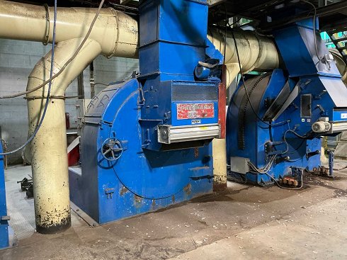 - Molino viruteador de anillo porta-cuchillas para fabricación de virutas planas. - Potencia del motor de la rueda de percusión 250 KW. - Potencia del motor del anillo de cuchillas 22 KW. - Velocidad de giro de la rueda de percusión 850 rpm. - Diámetro del círculo de corte 1200 mm. - Número de cuchillas 49. - Longitud de las cuchillas 450 mm. - Producción máxima hasta aprox. 10000 kg/h (dependiendo del tipo de madera, humedad y espesor de las virutas). - Tolva superior de alimentación con sistema vibratorio e imán para separación de elementos metálicos. - Desempedrador. - Condiciones de funcionamiento de esta máquina: sin comprobar. - Venta EX WORKS. Desmontaje, desconexión, carga y retirada a cargo del comprador, quien deberá cumplir la normativa vigente en materia de prevención de riesgos laborales, seguridad y salud en trabajos industriales, aportando la documentación, seguros y acreditaciones necesarias.