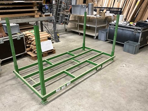 Palé de estacas con 4 postes de inserción Desmontable Nuestros palés de soporte cumplen con la normativa CE y vienen con la marca CE. Los palés de estacas son apilables y, por tanto, ideales para la formación de almacenamiento de bloques o para la carga óptima de camiones y vagones. Los palés de estacas crean rápidamente espacio de almacenamiento y pueden considerarse como estantes móviles. La compactación óptima de los vacíos es ventajosa: los soportes de inserción pueden retirarse vacíos y colocarse en el palet. Los palés pueden apilarse unos sobre otros para ahorrar espacio y requieren solo una pequeña capacidad de almacenamiento hasta el siguiente uso. Las ventajas de los palés de soporte de Padberg: diseño robusto y apilable gracias al uso de materiales estables y una mano de obra cuidadosa. Superficie metálica: pintada de verde (RAL 6017). Capacidad de carga: Carga adicional de 0,75 t por apilabilidad 1,80 t (por favor consulte por la versión reforzada). Nota importante: De una |
