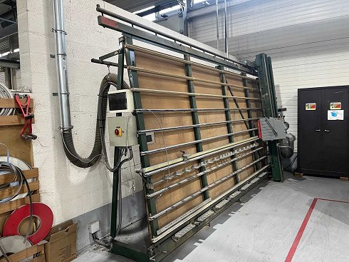 Número de serie: 11217 Voltaje: 380 V – 50 Hz Diámetro mínimo de la pala: 244 mm Diámetro máximo de la pala: 250 mm Velocidad de rotación: 5.250 rpm Estado: En funcionamiento Documentación: Disco disponible Origen: Italia Información adicional: Máquina de cortar madera tipo sierra vertical para paneles