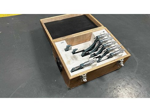 Mitutoyo Micrometer Set en estado de caja de madera : Utilizó 6 micrómetros analógicos Mitutoyo • Alcances: 0–150 mm • Precisión ±0,01 mm • Modelos visibles: 50–75 mm, 75–100 mm, 100–125 mm, 125–150 mm.