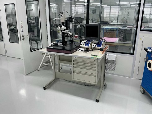 Función de microscopio medidor: función de medición digital o basada en oculares. Incluyendo 2 fuentes de luz fría halógenas LCD Schott KL 1500; 1 monitor Sony con montura de aluminio Ergotron, mesa de trabajo con 4 cajones, dimensiones: 1200 mm x 750 mm x 850 mm (L/W/H)
