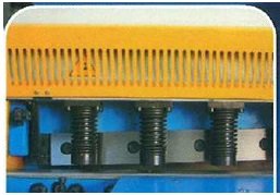 Montado sobre el basculante de la máquina está compuesto por dos husillos sobre las que se colocan las correspondientes tuercas en caja blindada y perfectamente engrasada. Para garantizar una mayor precisión y mejor desplazamiento se incorpora en cada husillo una guía en paralelo. Con unos muelles especiales, permite amortiguar los impactos de la chapa sobre la barra transversal rectificada que hace a la vez de referencia para efectuar los cortes en la longitud deseada con lo que se consigue una precisión de medida y una duración de estos elementos por tiempo muy largo.