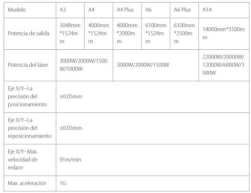 Tabla de características de máquina de corte por láser Bodor Serie A