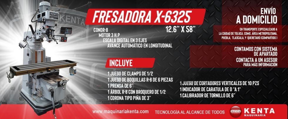 maquinaria industrial kenta s. a de c.v. visitamos en nuestra bodega para que compruebes la calidad de nuestros accesorios y equipos. te invitamos a visitar todas nuestras redes sociales, asi como los vídeos de nuestro canal de youtube para que conozcas un poco mas acerca de nosotros. fresadora edicion especial modelo: x6325 caracteristicas: fresadora x6325, convencional numero 3 edición especial. ¿porque edición especial? •mesa de 12.6" por 58" (todas en el mercado son de 10" por 54") •peso neto 1300 kilos (peso regular en el mercado 900 kilos) •la fresadora kenta, tiene estructura patentada, su cuerpo es más robusto en comparación a los demas modelos de la competencia, ofreciendo un menor rango de vibración. •está diseñada con doble prisma (cola de milano) en la bancada horizontal. •la fundición es en material ht250, baja tensión abrasiva y sísmica. •su husillo principal este fabricado con materiales de alta calidad y armado con las más estrictas normas de calidad, lo que permite una mejor precisión. datos técnicos: Modelo: X-6325 Grado automático: manual. Certificación: iso 9001. Escala digital: 3 ejes. Tamaño de la mesa: 320*1470 mm (12,6” x 58”). Máximo movimiento longitudinal (x): valor principal 720- máximo 920 mm. Máximo movimiento longitudinal (y): 410 mm. Máximo movimiento longitudinal (z): 400 mm. Ranuras t: 3 Tamaño de la ranura t: 16 mm. Distancia de la nariz del husillo a la superficie de la mesa: 50-455 mm. Máximo viaje del cabezal: 360 mm. Forma cónica del husillo: r-8 Recorrido de la pluma: 127 mm. Velocidad de la pluma: 0.04/0.08/0.15 Velocidad del husillo: estándar 16 (velocidades):60 hz: 80-5440 rpm. Motor del husillo: 3 hp Inclinación del cabezal: hacia adelante y a la izquierda 45° Dimensiones: 2000x1750x20 mm Peso: 1300 kg. Contamos con todo lo nesesario para tu taller o negocio: Fresadoras. Tornos. Taladros. Cizallas. Dobladoras. Centros de maquinado. Tornos cnc y gran variedad de accesorios. ::: Facturación ::: • toda compra se factura electrónicamente, asegúrate de enviar tus datos de facturación al realizar la compra. • si deseas recibir la promocion del mes, favor de mandar datos fiscales, correo, numero de contacto y nombre. y un asesor te atendera con gusto.