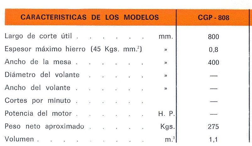 | Detalles | CIZALLA GUILLOTINA, MODELO CGP-808, de 800 mm. de ancho máximo, espesor max. 0’8 mm. en Hierro 40 Kg/mm2, para Hierro, Aluminio, Cobre, Carton, Papel, Plastico, accionamiento a pedal sin motor. Separacion entre cuchillas regulable para adaptarse a los diferentes espesores y tipos de material. Tope trasero regulable con cinta milimetrada, y regulable para corte a grados. Tope delantero. Mesa para apoyo de Material de 400 mm y soportes de ampliacion incluidos. |