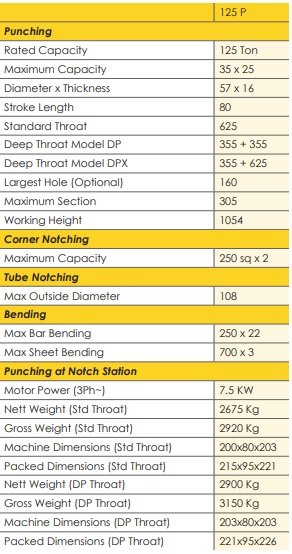 Ajuste completo de la carrera Avance lento de baja potencia y carrera ajustable Punzonado universal de hasta 57 mm de serie Mesa perforadora grande con refuerzo multiusos: bloque de mesa extraíble para perforar el canal voladizo / brida de vigas Máquinas con requisitos de mantenimiento muy bajos Amplia variedad de aplicaciones: perforación de orificios grandes, engarzado, muesca de tubos, doblado de barras, doblado de hojas, aplicaciones de punzonado, etc. Escote de gran profundidad estándar Alivio de sobrecarga en el sistema hidráulico Rodamientos, sellos y válvulas intercambiables comerciales en Europa