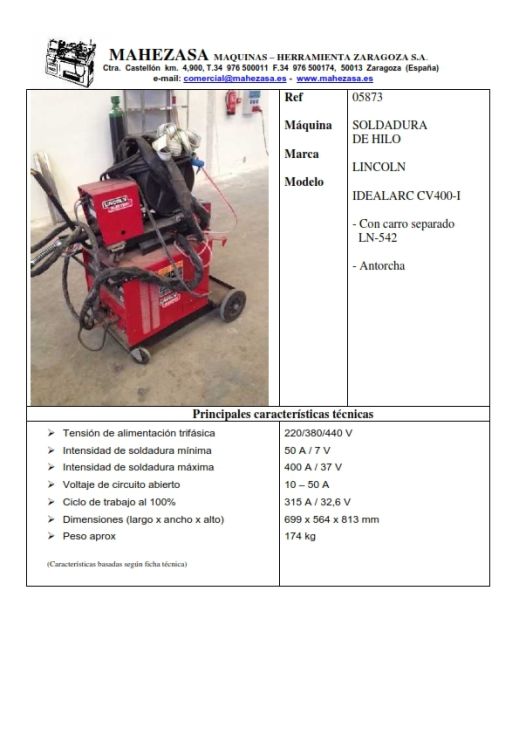 Con carro separado LN-542 y antorcha, ciclo de trabajo al 100% 315 A / 32,6 V