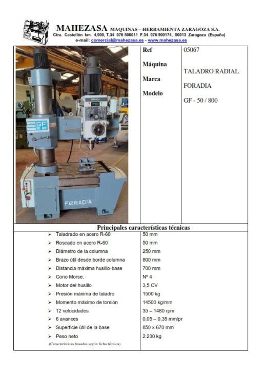 Capacidad de taladrado en acero 50 mm brazo útil 800 mm