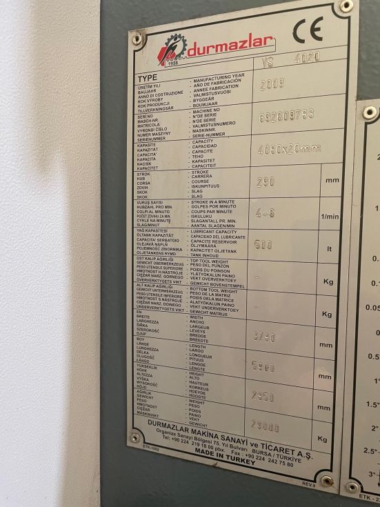 | Detalles | Cizalla Hidraulica corte vertical DURMA CNC modelo VS 4020 de 4080 x 20mm,con CNC Cybelec mod 60,corte Vertical, tope motorizado, potencia instalada 45Kw ,en un estado seminuevo, año 2009 , 29 tns |