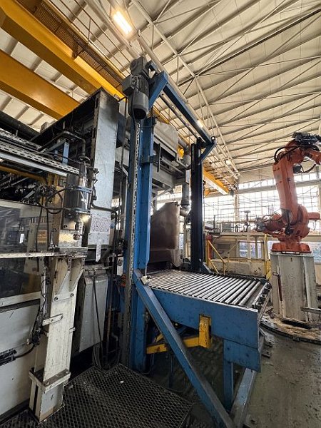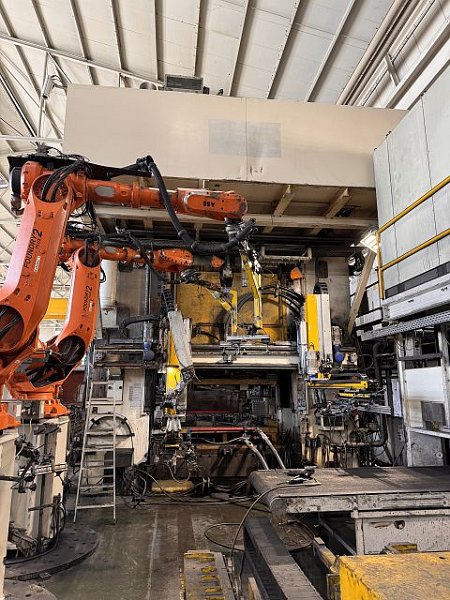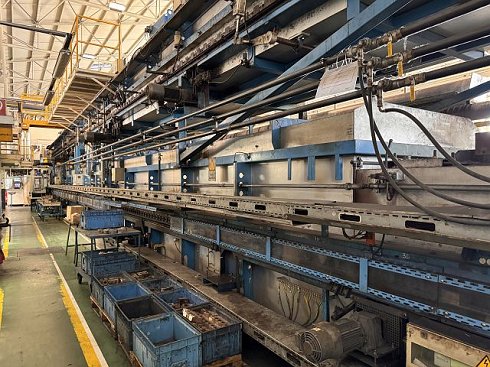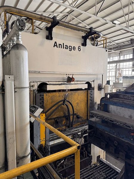 | Detalles | CONTROLS PLC SIEMENS S7-400 TIPO DE PRENSA Sistema de accionamiento: Hidráulico Número de bielas / Cilindros: 1 Expulsor superior: No Cojines inferiores: No Agujero mesa: No Dirección de alimentación: back-front FUERZA Fuerza total: 1000 to MESA INFERIOR Anchura de la superficie de sujeción: 2066 mm Profundidad de la superficie de sujeción: 2000 mm Altura de la mesa respecto del suelo: 630 mm CARRO Carrera: 900 mm CARRO Velocidad de aproximación: 600 mm/s Velocidad de trabajo mín.: 15 mm/s Velocidad de trabajo máx.: 40 mm/s Velocidad de retroceso máx.: 390 mm/s Fuerza de retroceso: 100 to DIMENSIONES DE TRABAJO Altura de cierre (carrera máx. y regulación arriba): 1710 mm Distancia máx. entre platos: 1700 mm DATOS DE CONEXIÓN ELÉCTRICOS Consumo de energía eléctrica (total): 160 kW Tensión de conexión: 400 V Frecuencia de la red: 50 Hz DIMENSIONES / PESO Altura sobre piso: 6500 mm Peso total aprox.: 140000 kg ACCESORIOS/ANEXOS (PRENSAS) Automatismo de prensa: Sí Sistema transfer: Sí acc. to actual accident protection regulation: Sí Certificado CE: Sí Complete hot forming line (sheet metal applications) consisting of: * 1000 to. hydraulic press LASCO * Schwartz furnace system: - max. lining width: 1700 mm - Furnace length: 27060 mm * Strothmann feeder * ABB loading and unloading robot |