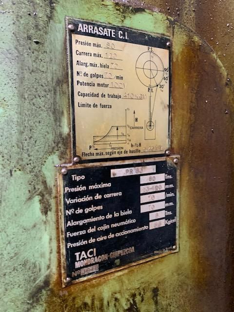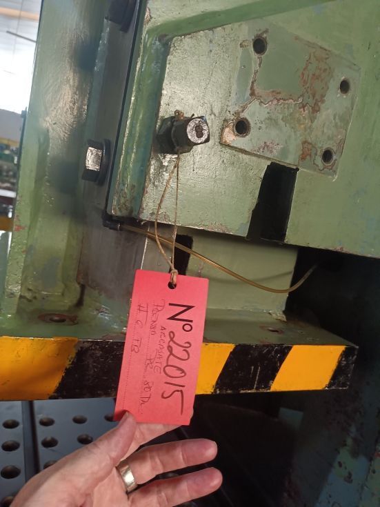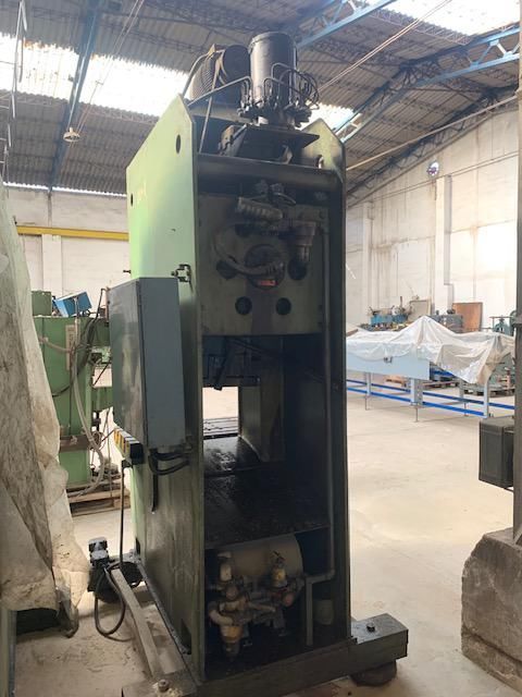 | Detalles | PRENSA EXC. ARRASATE. Tipo: PR-80. Motor: 10 Hp a 380V. País de Origen: España. Mesa 900 x 560 mm. Luz: 350mm. Peso 5.050 kg. Golpes: 70. Paso entre columnas: 400. Cursas: 20-120. Escote: 300. Agujero en mesa: 360 x 360. Superficie de maza: 600 x 500. Altura de mesa: 950. Accesorios: Arandela de seguridad, placa supletoria, Cojín neumático, engrase automático nuevo a estrena, disparo a dos manos y pedal. Dimensiones: 1.620 x 1.300 x 3.070. USADA |