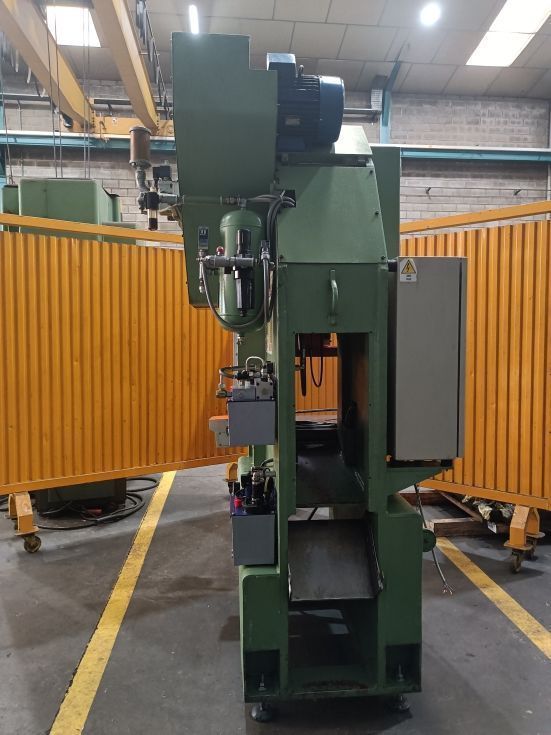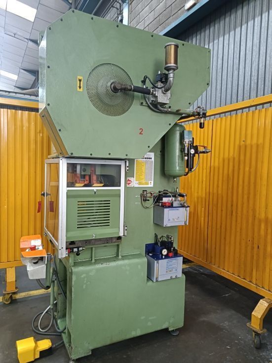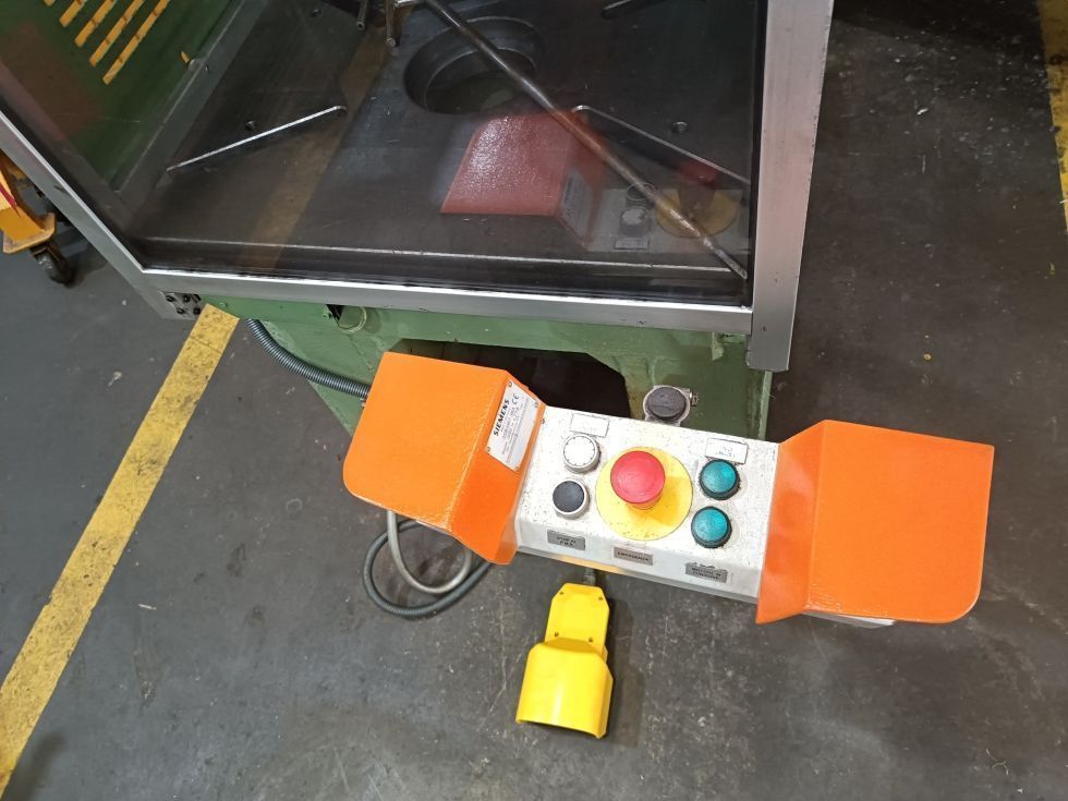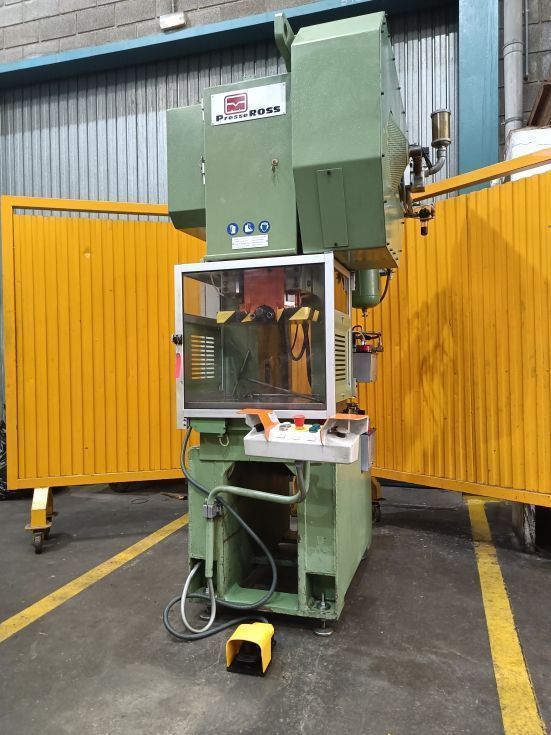 PRENSA EMBRAGUE NEUMÁTICO. ROSS. Motor: 3Hp 380V. Toneladas: 40. Año de fabricación: 2.003. País de Origen: Italia. Mesa: 600x45 mm. Luz: 370 mm. Peso: 2.200 Kg. Golpes: 150. Paso entre columnas: 250. Cursas: 7-100 mm. Escote: 170 mm. Agujero en mesa: Ø120. Superficie de maza: 400 x 250. Altura de mesa: 820 mm. Accesorios: Disparo a dos manos y pedal, Seguro antibloqueo hidráulico, engrase automático, pantallas de seguridad. Reutilización aceite de engrase. Dimensiones: 1.000 x 1.000 x 2.350 mm. Estado casi nueva. Con C.E.