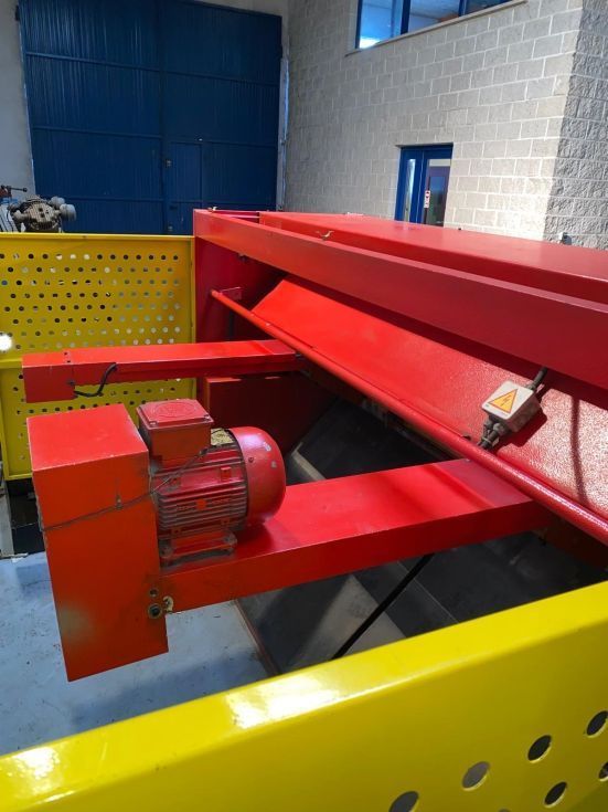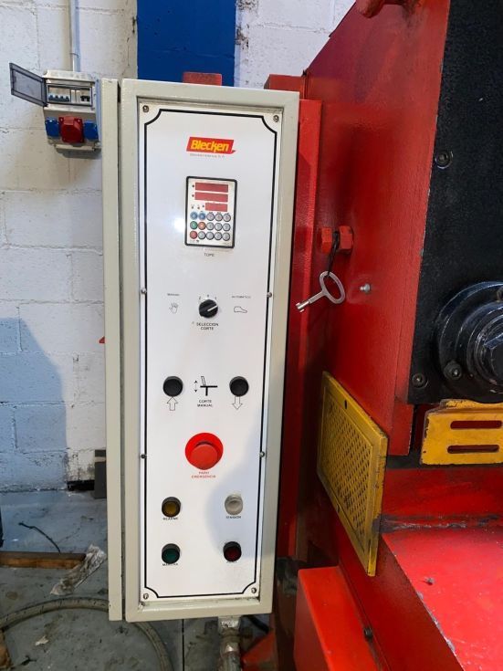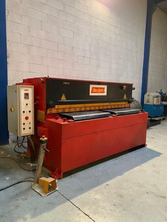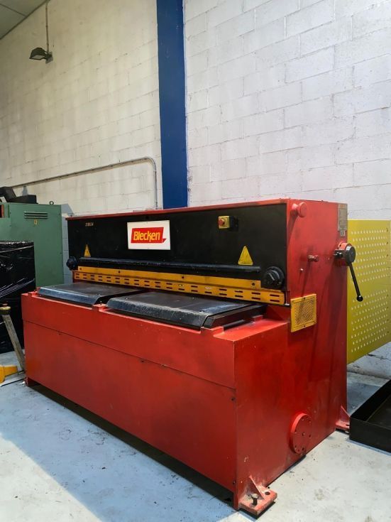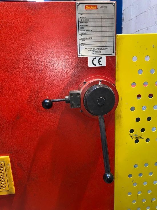 MARCA BLECKEN Modelo CBM-210 Longitud de corte 2100 mm Capacidad de corte 4 mm (42 Kg/mm2) Ángulo de corte 1.5º Nº de cortes por minuto 42 Altura de la mesa 900 mm Carrera tope 1000 mm Motor principal 7,5 Kw Motor tope trasero 0.75 Kw IP 54 Dimensiones maquina 2750 x 2650 x 1560 mm Peso maquina 2600 Kg