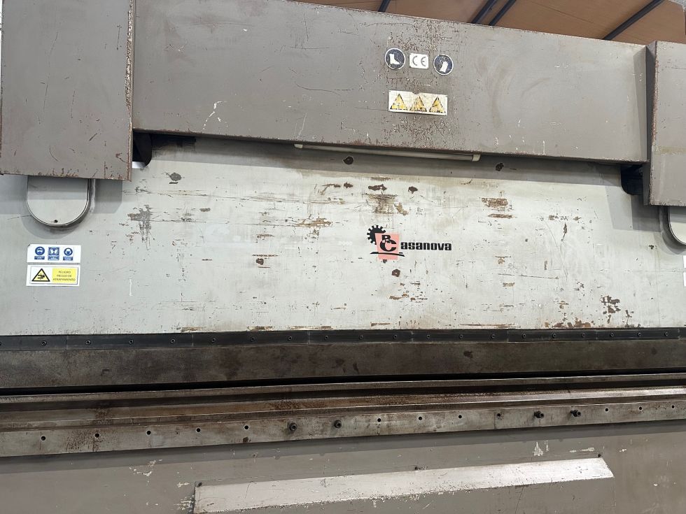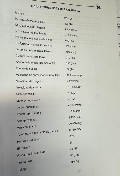Plegadora Hidraulica Casanova  modelo XCN 20 300x 4100mm de 4100mm x 300tns,con mesa compensadora hidraulicamente,  paso entre montantes 3050mm ,Altura desde el suelo a la mesa 900mm,profundidad del cuello de cisne 500mm,velocidad de aproximacion regulable 100mm/seg , velocidad de plegado 7 mm/seg , velocidad de subida 70mm/seg , potencia motor principal 25cv , peso 19500kg , maquina con diverso  utillaje , maquina del año 2002, maquina en buen estado