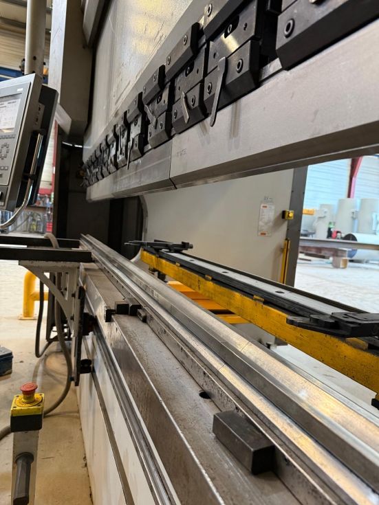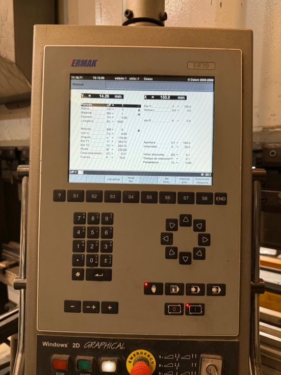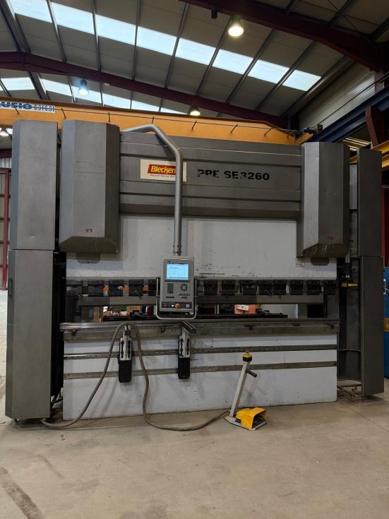 | Detalles | Plegadora hidraulica BLECKEN Modelo PPE SE 3260 Año 2010 Control DELEM 4 EJES - ERMAK ER70 Presión máxima 260 T Longitud de plegado 3100 mm Potencia del motor 22 kW – 380 V Peso 15200 Kg Dimensiones maquina 4550 x 2350 x 2900 mm Eje X / Eje Y1 / Eje Y2 / Eje R