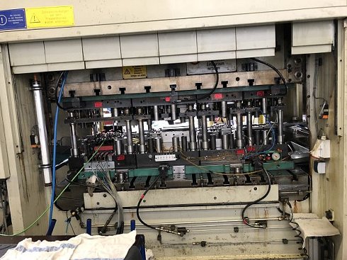 | Detalles | CONTROLS PLC SIEMENS S7 TIPO DE PRENSA Sistema de accionamiento: Rodillera Tipo de bastidor: Forma "H" Monobloc Paso entre montantes lateral (paso banda): Sí Número de bielas / Cilindros: 2 Dirección de alimentación: Izquierda a derecha FUERZA Fuerza total: 315 to Energía nominal: 38 kNm MESA INFERIOR Anchura de la superficie de sujeción: 2000 mm Profundidad de la superficie de sujeción: 1200 mm Grosor de superficie de sujeción: 200 mm CARRO Fuerza carro max.: 315 to Anchura de la superficie de sujeción: 1995 mm Profundidad de la superficie de sujeción: 1100 mm Carrera: 160 mm N° golpes / minuto máx.: 80 /min CARRO (PRENSA MECÁNICA) Regulación del carro: 140 mm N° golpes / minuto mín.: 20 /min N° golpes / minuto máx.: 80 /min Potencia motor principal: 90 kW DIMENSIONES DE TRABAJO Altura de cierre (carrera máx. y regulación arriba): 555 mm Paso entre montantes frontal: 2060 mm Ventanas laterales (ancho paso banda): 1060 mm ESPECIFICACIONES GENERALES (LINEA) Ancho de banda máx.: 400 mm Espesor max.: 5 mm CARGADOR DE BOBINAS Peso máx. de bobina: 4 to DEVANADORA Tipo: single reel, traversable Ancho de banda máx.: 400 mm Ancho de banda mín.: 30 mm Peso máx. de bobina: 4 to Diámetro exterior máx. de bobina: 1500 mm Diámetro interior mín. de bobina: 460 mm Diámetro interior máx. de bobina: 530 mm Movimiento: 1500 mm UNIDAD APLANADORA Ancho de banda máx.: 400 mm Ancho de banda mín.: 50 mm Sección máx. de material (450 N/mm2): 1000 mm² Número de rollos aplanadores: 9 Diámetro rodillos aplanadores: 50 mm Núm. Rodillos entrada/salida alim.: 150 Velocidad de alimentación mín.: 5 m/min Velocidad de alimentación máx.: 50 m/min ALIMENTADOR Tipo de alimentador: Rodillos Ancho de banda máx.: 400 mm Espesor max.: 5 mm DATOS DE CONEXIÓN ELÉCTRICOS Tensión de conexión: 400 V Frecuencia de la red: 50 Hz DIMENSIONES / PESO Peso total aprox.: 45000 kg ACCESORIOS/ANEXOS (PRENSAS) Devanadora: Sí Enderezador: Sí Alimentador: Sí Knucke Joint press for slow movement when approaching BDC Coil Reel KOHLER 4000.1 Straightener KOHLER KRM 50.400/9 KOHLER Loop control BÜ5 Roll feed KOHLER WVE 120/400 HIESSL belt lubrication (wide spray) UNIDOR control system Tool loading consoles |