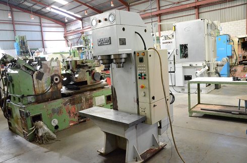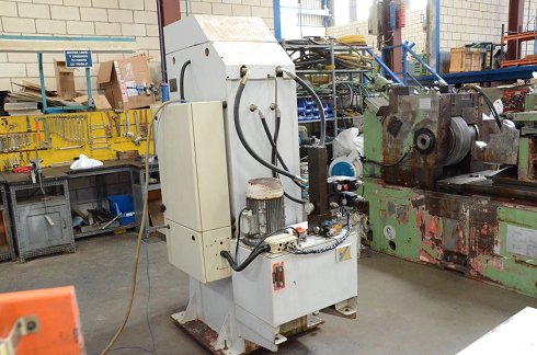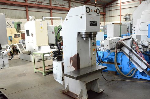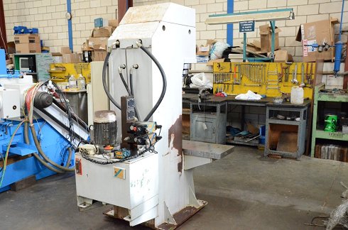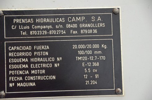DetallesAlto: 2.100 mm Ancho: 1.300 mm Largo: 1.200 mm Escote: 160 mm Fuerza: 20 TN Voltaje: 220/380 V Potencia total: 5.5 CV Ø del vástago: 100 mm Apertura máxima: 650 mm Nº fabricación: 21.204 Carrera del vástago: 100 mm Velocidad de ascenso: 27 mm/s Superficie de la mesa: 1050 x 360 mm Velocidad de descenso: 18 mm/s Specification: Hidráulica Adjuntos