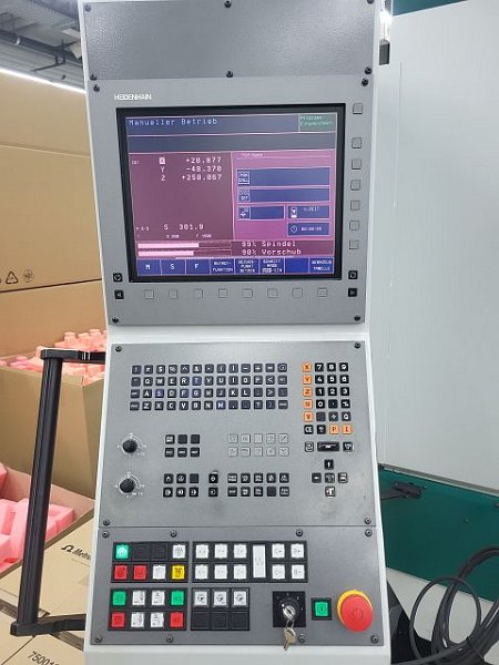 | Detalles | CONTROLS Control CNC HEIDENHAIN TNC 426 ZONA DE TRABAJO -CÚBICA- número de ejes de procesamiento (sin ejes paralelos): 3 Trayecto de desplazamiento eje X: 500 mm Trayecto de desplazamiento eje Y: 350 mm Trayecto de desplazamiento Z: 610 mm MESA Anchura de la superficie de sujeción: 920 mm Profundidad de la superficie de sujeción: 380 mm HUSILLO / CABEZAL Gama de velocidades de: 50 /min Gama de velocidades a: 18000 /min Tomaherramientas: ISO SK 30 ALMACÉN DE HERRAMIENTAS Número de posiciones de la herramienta: 24 DATOS DE CONEXIÓN ELÉCTRICOS Tensión de conexión: 400 V Frecuencia de la red: 50 Hz DIMENSIONES / PESO espacio requerido -izquierdo/derecha-: 2000 mm espacio requerido -delante/atrás-: 1700 mm Altura total: 3000 mm Peso total aprox.: 3200 kg EQUIPO ADICIONAL Transportador de virutas: No Unidad de refrigerante: Sí Sistema refrigeración interior: No Revestimiento del área de trabajo: Sí Certificado CE: Sí Machine in TOP condition - Power ON : about 37000 h - Spindle hours: about 3640 h Equipment: - various tool holders - 1 x Mecatool clamping system - machine on power to inspection |