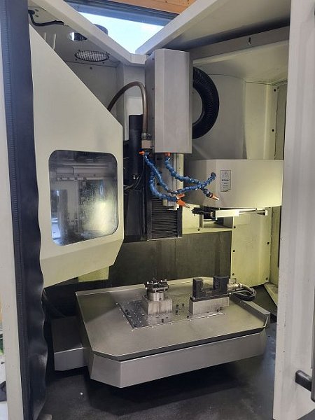 | Detalles | CONTROLS Control CNC HEIDENHAIN ITNC 530 ZONA DE TRABAJO -CÚBICA- número de ejes de procesamiento (sin ejes paralelos): 5 Trayecto de desplazamiento eje X: 270 mm Trayecto de desplazamiento eje Y: 250 mm Trayecto de desplazamiento Z: 250 mm HUSILLO / CABEZAL Gama de velocidades de: 10 /min Gama de velocidades a: 40000 /min Tomaherramientas: HSK A25 potencia del motor: 10 kW ALMACÉN DE HERRAMIENTAS Número de posiciones de la herramienta: 60 AUTOMATIC WORKLOAD EQUIPMENT Número de posiciones el almacenador: 24 DIMENSIONES / PESO espacio requerido -izquierdo/derecha-: 2300 mm espacio requerido -delante/atrás-: 2200 mm Altura total: 2200 mm Peso total aprox.: 2800 kg Operating hours: Spindle 12,324h Programme run 27,356 Accessories: -2-axis NC rotary table with EROWA -tool measurement Blum -measuring probe -tool magazine HSK25 -workpiece magazine for EORWA ITS50 tool holder 30 pieces -oil mist extraction -spindle alignment mandrel |