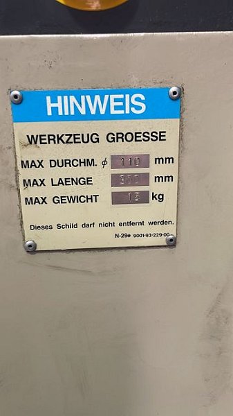 | Detalles | ZONA DE TRABAJO -CÚBICA- Trayecto de desplazamiento eje X: 1000 mm Trayecto de desplazamiento eje Y: 510 mm Trayecto de desplazamiento Z: 450 mm MESA Anchura de la superficie de sujeción: 1120 mm HUSILLO / CABEZAL Gama de velocidades a: 10000 /min potencia del motor: 18.5 kW ALMACÉN DE HERRAMIENTAS Número de posiciones de la herramienta: 20 Diámetro máximo de la herramienta : 110 mm Longitud máxima de la herramienta: 300 mm Peso máximo de la herramienta: 15 kg AUTOMATIC WORKLOAD EQUIPMENT pallet length: 450 mm pallet width: 100 mm Número de paletas: 2 DIMENSIONES / PESO espacio requerido -izquierdo/derecha-: 2900 mm espacio requerido -delante/atrás-: 2400 mm Altura total: 2785 mm Peso total aprox.: 8200 kg |