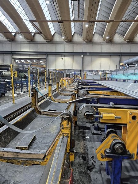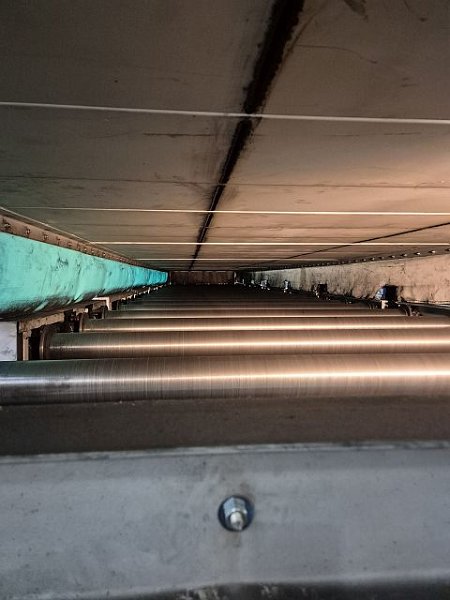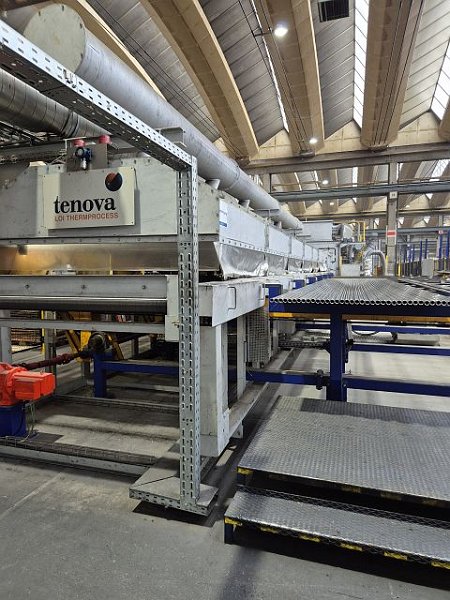 | Detalles | CHARACTERISTICS HEAT TREATMENT EQUIPMENT temperature max.: 950 °C Clear width 2,200 mm Usable width 2,070 mm Usable height 400 mm Working height 1,300 mm Inlet roller conveyor 14,700 mm Inlet box 2,500 mm Annealing furnace 29,169 mm (Annealing furnace clear length) approx. 26,769 mm Cooling section (HT and NT) 51,000 mm Outlet box 2,500 mm Outfeed roller conveyor 14,660 mm Total length 114,530 mm (annealing furnace and cooling section) N2 purge gas volume 420 m3 Furnace design: Roller hearth continuous furnace Material: Tubes Outer diameter: 14 - 180 mm Wall thickness: 0.8 – 8.0 mm Length: 4.0 – 13.0 m Surface before annealing: - - Throughput at 920 °C annealing material temperature Throughput at 700 °C annealing material temperature Reference pipes: 25 x 2.5 x 8000 mm 33 x 3.5 x 8000 mm 40 x 3.5 x 8000 mm 55 x 2.8 x 8000 mm 63 x 4 x 8000 mm 75 x 6 x 8000 mm 110 x 8 x 8000 mm Tube outlet temp., depending on tube surface: 125 - 150 °C Roller pitch inlet roller conveyor: 620 mm Roller pitch inlet box: 620 mm Roller pitch annealing furnace: approx. 430 mm Roller pitch cooling section: 500 mm Roller pitch outlet box: 620 mm Roller pitch outlet roller conveyor: 620 mm Roller dimensions: Annealing furnace: 155.4 x 14 mm 1.4848/1.4832 Front section HD cooling section: 157.0 x 10 mm 1.4826 (7 pieces) Remaining cooling section: 133.0 x 4 mm St 37 Max. permissible roll hearth load at a working temperature of 920 °C and even distribution of the hearth: 350 kg/m Furnace floor: Refractory lightweight brick: 130 mm Insulating bricks: 130 mm Mineral fibre board: 50 mm Side: Refractory lightweight bricks: 230 mm Mineral fibre board: 100 mm Ceiling: Suspended ceiling bricks and wool insulation 330 mm Ceiling thickness Ring bricks for roller passages made of fibre material Number of control zones: 6 (gas-heated) Operation of control zones: - (gas-heated) ON/OFF, with round-the-clock control - (electrically heated) ON/OFF, with thyristor control Thermocouples: NiCr-Ni Temperature recording range: 0 - 1,000 °C Temperature control measuring range: 0 - 999 °C Working temperature range: 450 - 950 °C Max. working temperature: 950 °C Throughput speed: 7.5 - 150 m/h Endogas consumption 84 litres per hour Automatic loading |