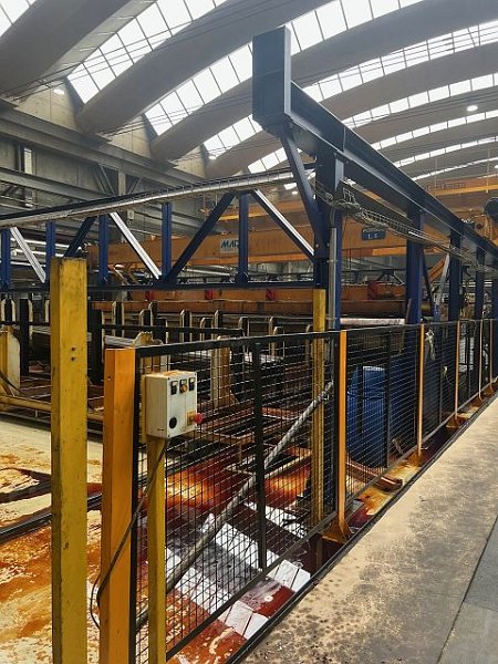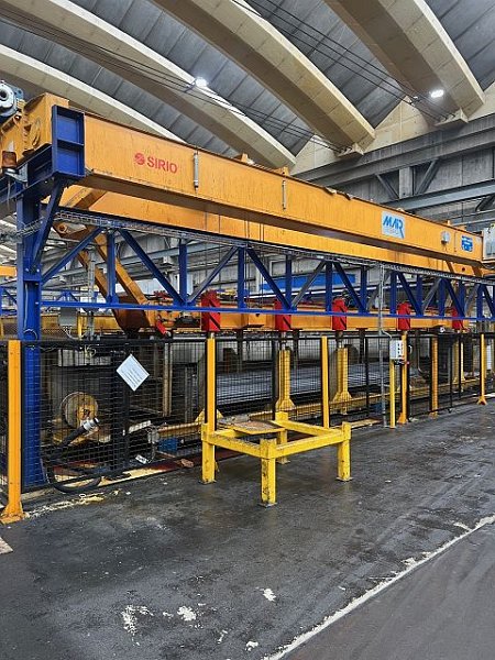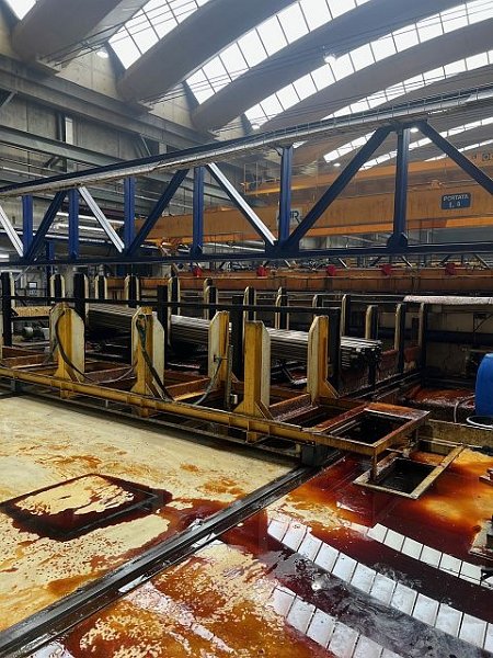 | Detalles | Plant for Drawing Oil Preparation in Tube Production The plant is designed for the optimal preparation of undrawn tubes prior to the subsequent drawing process. In this process, the tubes are evenly treated in drawing oil baths, ensuring homogeneous wetting of the surface. The drawing oil bath provides uniform lubrication, which reduces frictional resistance during the drawing operation, improves surface quality, and increases tool life. The system is designed to ensure a continuous material flow as well as constant bath temperature and quality. It therefore represents a key process step in tube manufacturing and significantly contributes to both the quality and cost-effectiveness of production. Technical Specifications of the Plant Automatic Bridge Crane Type: Matr. 2981 t.6,5 Max. translation speed: 40 m/min class: A6 (FEM 1.001 – ISO) Number of wheels: 4, Ø 315 mm Crane gauge: 13,000 mm Net crane weight: 8,000 kg Motor: Type FC90LFECCL-4, power 1.5 kW, protection degree IP55 Brake: Disc type, DC V400 Gearbox: Type TP 315/90BR, ratio 1/35 Power supply: 400 V – 50 Hz |