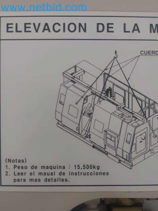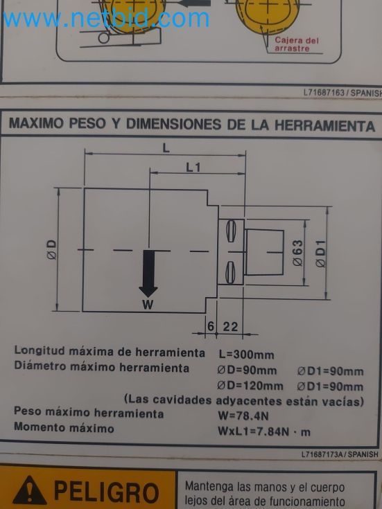 Venta en www.netbid.com hasta el 02/Dic/25 9 Ejes de trabajo Capacidades: · Longitud de torneado: 1.520 mm · Diámetro de volteo: ø 540 mm · Giro sobre la bancada: ø 750 mm · Giro sobre carro transversal: 600 mm · Diámetro de paso de la barra: 76 mm Cabezal de fresado: · Recorrido del eje X: 555 mm · Recorrido del eje Y: 160(+-80) mm · Recorrido del eje Z: 1.595 mm · Recorrido del eje A: 1565 mm · Grado del eje B: 240º(+-120º) Sistema de herramientas: Capto C6 Plazas en almacén de herramientas: 40 Velocidad del husillo: 10.000 Rpm Velocidades rápidas de avance ejes X/Z/Y/A: 24/24/16/24 m/min Torreta inferior: · Recorrido del eje X: 185 mm · Recorrido del eje Z: 1.640 mm · Número de herramientas: 12 ud Torreta motorizada Velocidad de rotación e la torreta: 4000 Rpm Husillo principal (izquierda) Velocidad husillo: 3.500 Rpm Contrahusillo (derecha) Velocidad del husillo: 3.500 Rpm Potencia husillo principal: 26 kW Potencia contrahusillo: 26 kW Potencia cabezal de fresado: 15 kW Controlador CNC: Fanuc 18 iT-B Horas de trabajo del husillo principal según contador: 556 h Horas de trabajo del contrahusillo según contador: 12513 h |