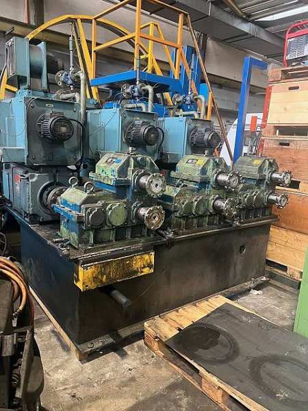 | Detalles | FEEDSTOCK STEEL STRIP Espesor max.: 4 mm Espesor mín. de fleje: 0.8 mm PRODUCT (PROFILE, TUBE) external diameter min.: 24.9 mm external diameter max.: 60 mm wall thickness min.: 0.8 mm wall thickness max.: 4 mm LINE CHARACTERISTICS Forming Process: rollforming welding process: HF inductive sawing process: travelling system consisting of: - large coil reel - Bandschweisseinrichtung - optional: horizontal band loop - side planer - forming unit - HF welding unit - units for outside scarfing, inside scarfing - each without impeders, tooling - cooling section - calibration unit with alternative calibration station for ovals, polygons - flying saw - chip blow unit - hexagon bundling- and binding unit optional roll-sets available for: forming section: 26,30, 32, 36, 38, 40, 44, 46, 52, 60 mm calibration section: 25, 26, 29.5, 29.89, 30, 32, 33, 33.4, 33.5, 33.7, 34, 35, 36, 37, 38, 39, 40, 42.4, 43, 44, 45, 46, 50, 51, 51.5, 57, 58, 60 mm without drawints  |