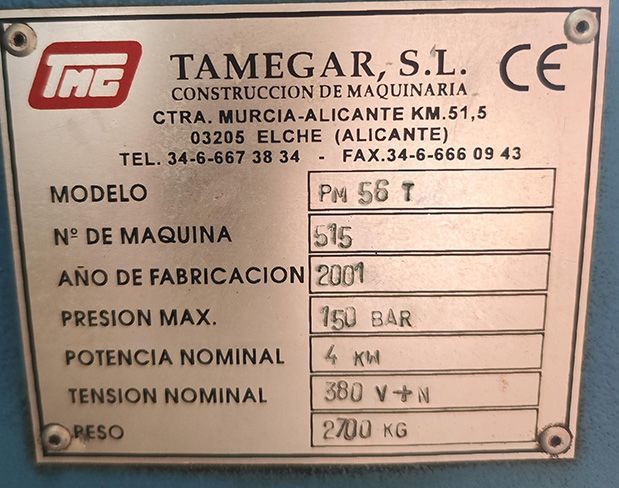 | Detalles | Prensa Hidráulica de Ajustar moldes Basculante marca TAMEGAR modelo PM 56 T Mesa con Ranura en T Tipo Basculante Dimensiones de la mesa 900X660 Mm Recorrido Mesa superior apertura/cierre 700 Mm Recorrido Mesa Inferior entrada/salida 700 Mm Presión Regulable De 10-50 Tn Presión Máxima 150 bar Distancia Mínima entre Mesas 200 Mm Mesa superior basculante Doble anclaje en posición recogida Peso máximo en la mesa 3000 Kg Máxima distancia entre mesas 700 Mm número de columnas 4 Guiadas Diámetro de las Columnas 70 Mm Peso de la Maquina 2700 Kg Numero de Maquina 515 Con Normas de Seguridad Marcado CE Año 2001 CON SU LIBRO |